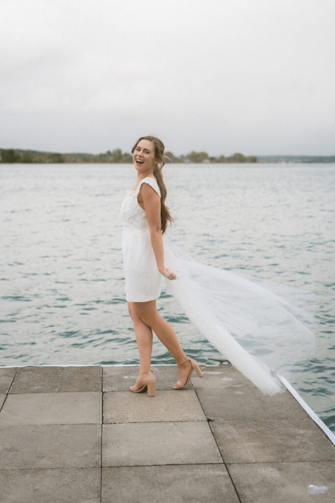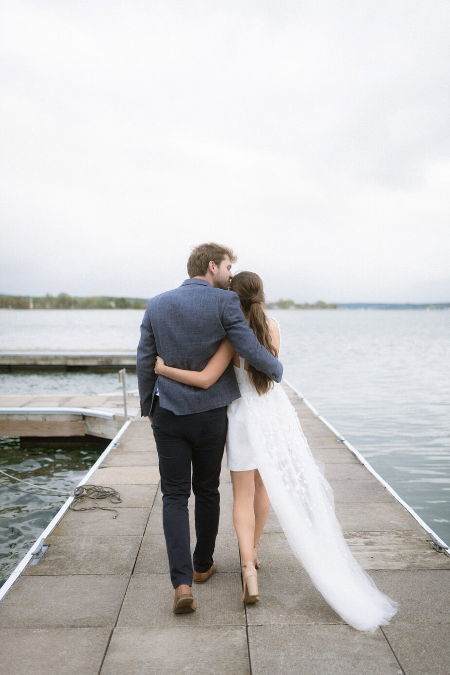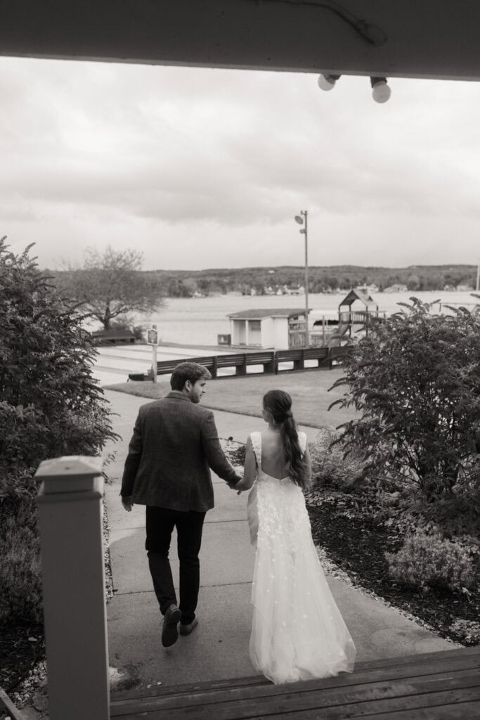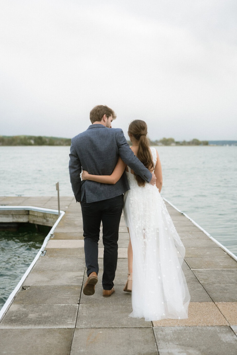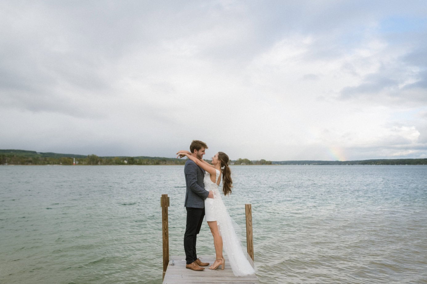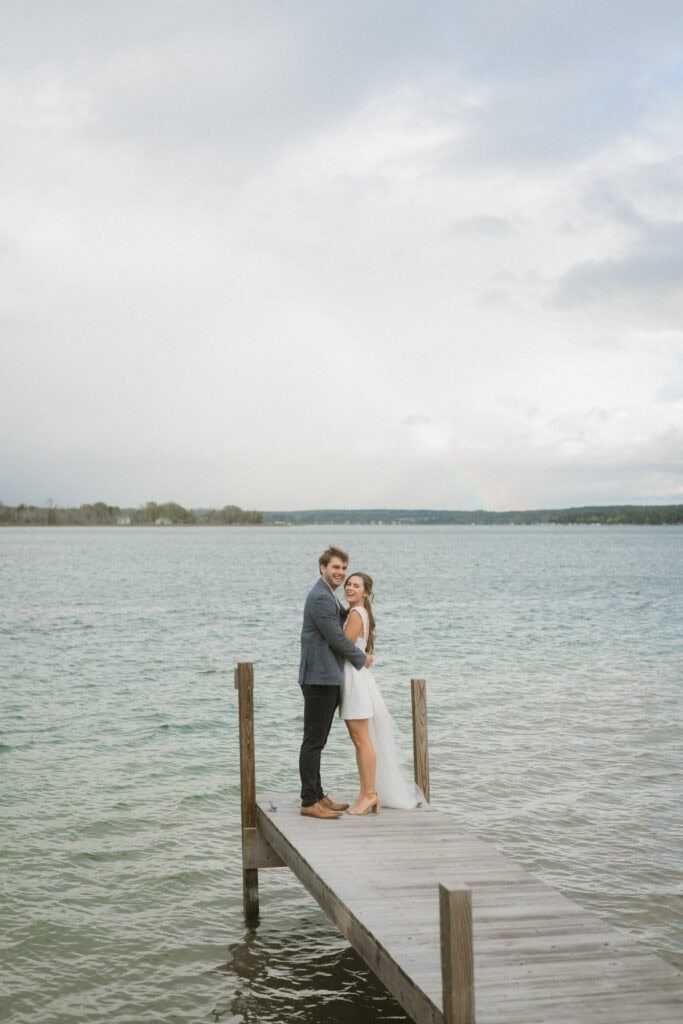 After our (rather cold, wet, and windy) wedding rehearsal that evening, Dan and I headed out to the docks on Portage Lake with Sarah, our wedding photographer, for some photos before the welcome dinner. A rainbow even showed up for us!