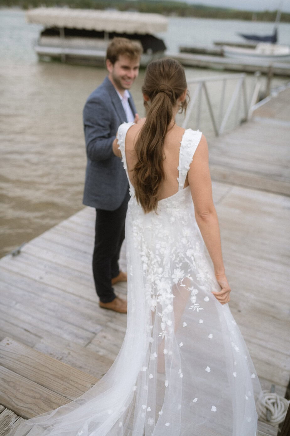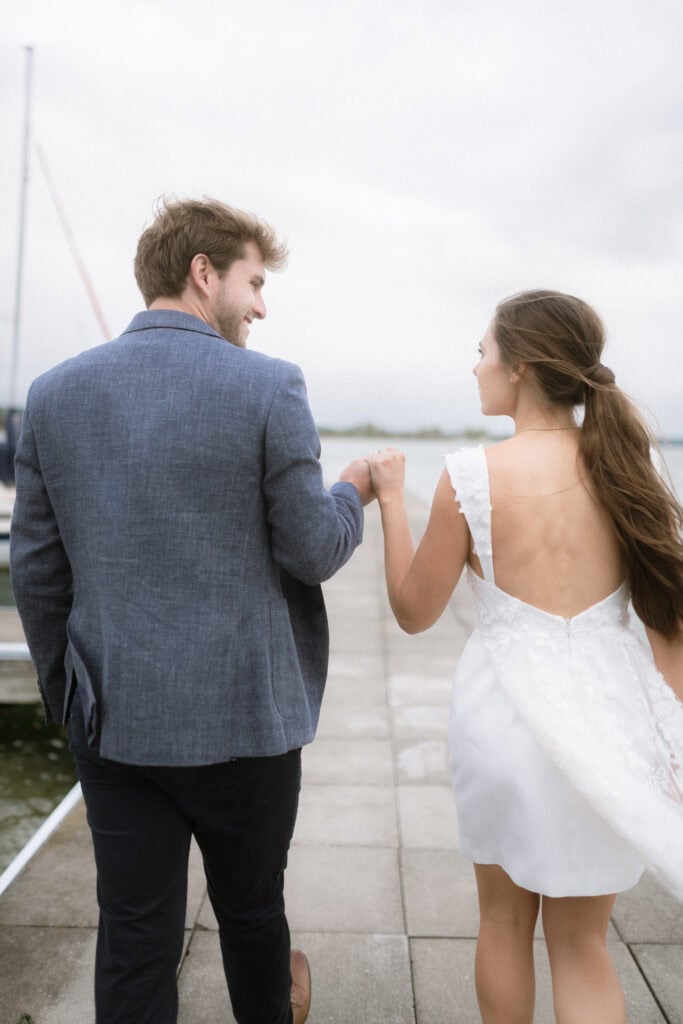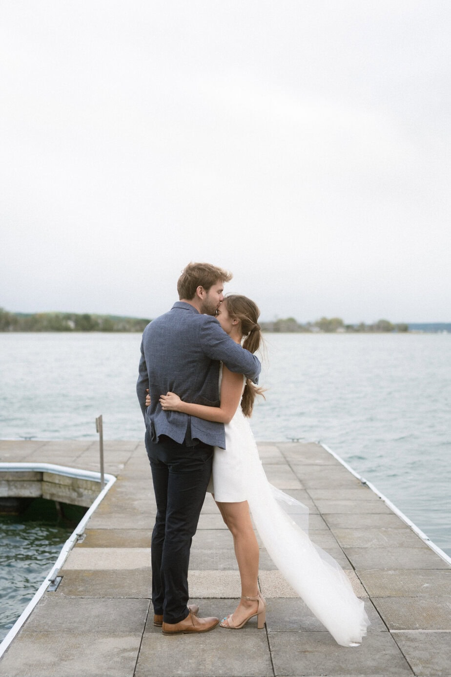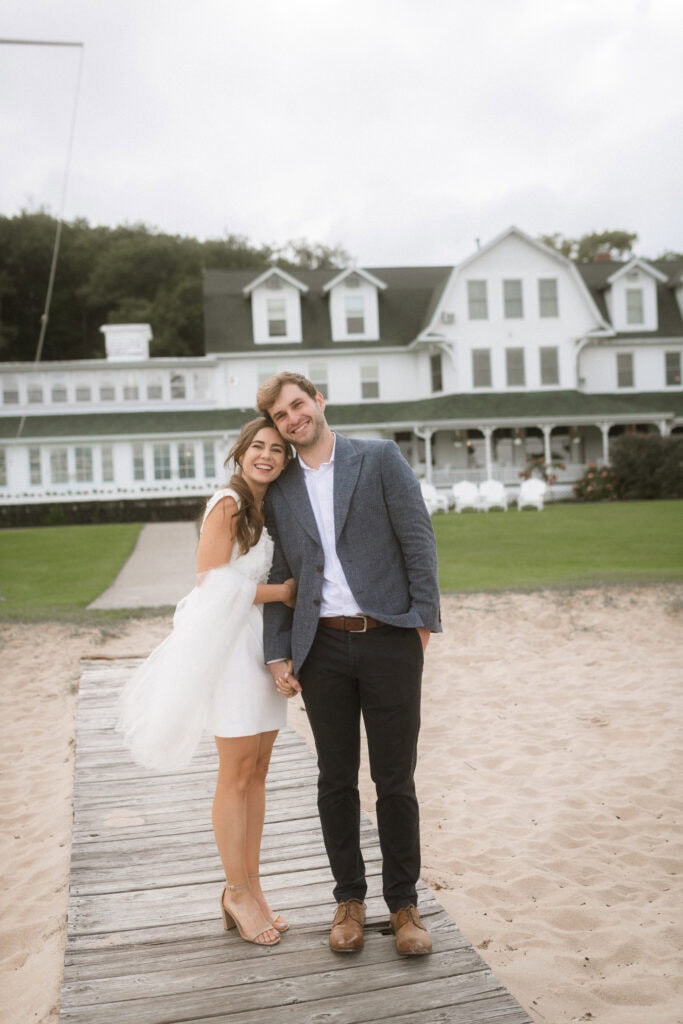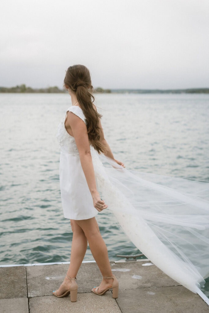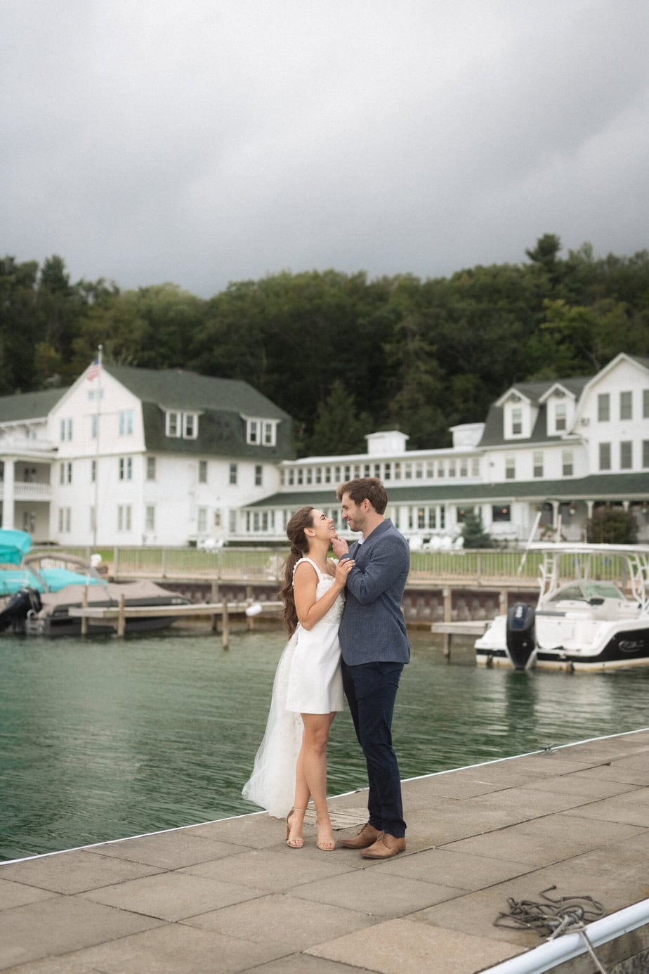 After our (rather cold, wet, and windy) wedding rehearsal that evening, Dan and I headed out to the docks on Portage Lake with Sarah, our wedding photographer, for some photos before the welcome dinner. A rainbow even showed up for us!