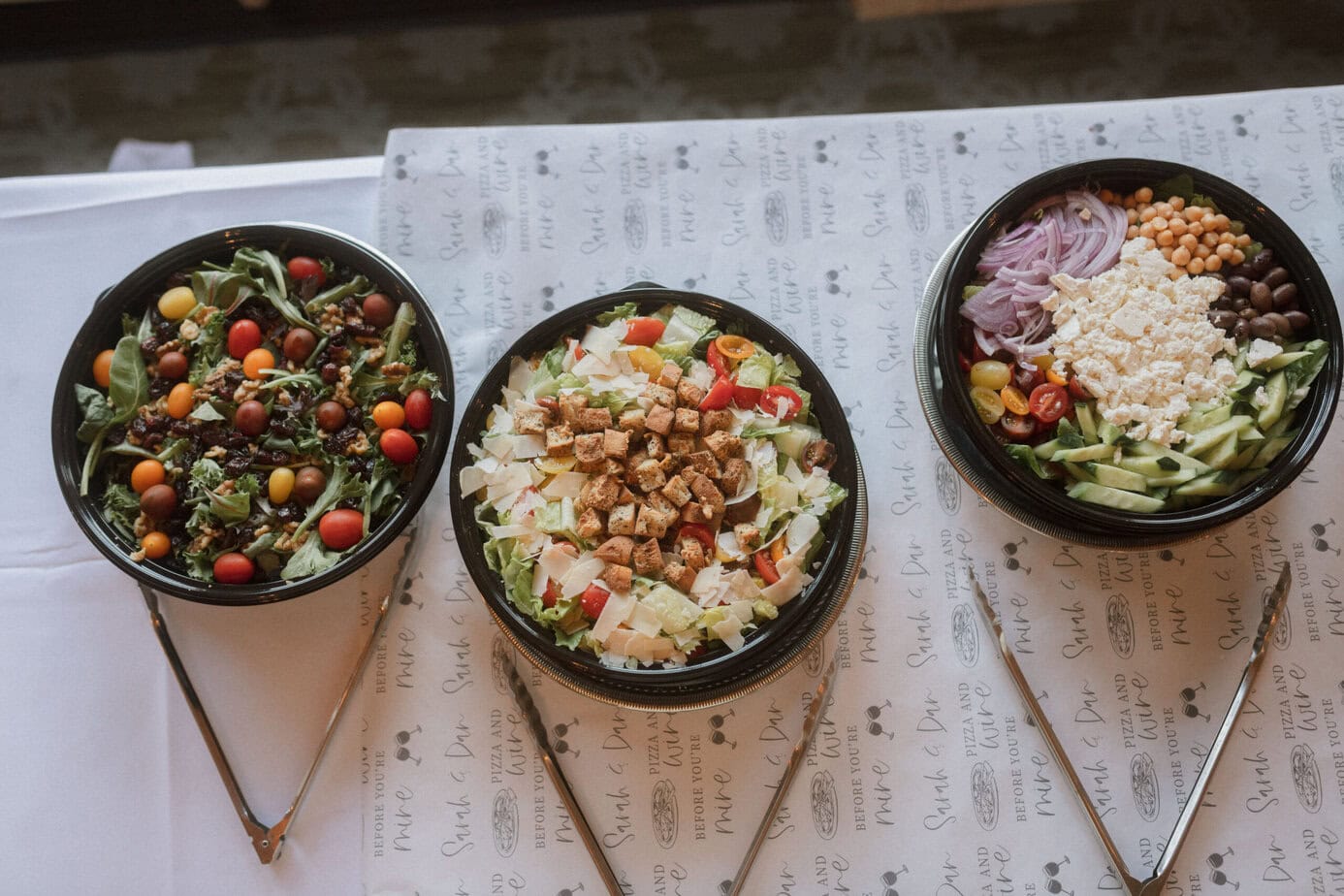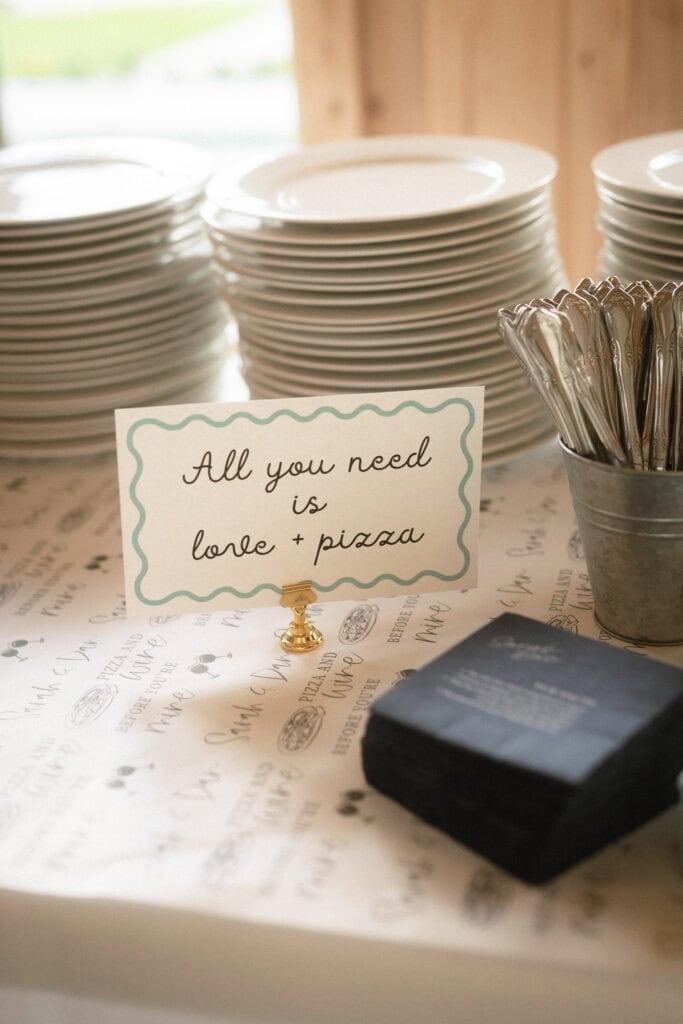 - Personalized paper table runner (“pizza & wine before you’re mine”) from Etsy