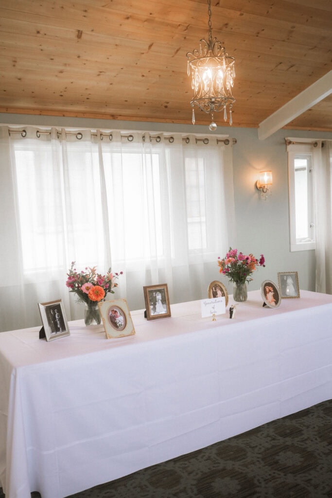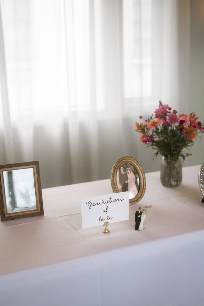 - A table with the wedding photos of our parents and grandparents (and even the cake topper from my parents’ wedding!)